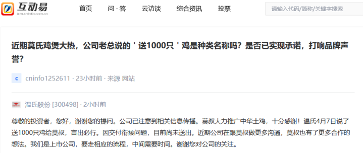中新经纬4月13日电近期,温氏股份答允“向莫氏鸡煲支援1000只鸡”的音尘备受怜惜。4月13日,温氏股份在投资者互动平台对此报酬称,公司言而有信,不外因委派衔尾问题,当今尚未送出。
