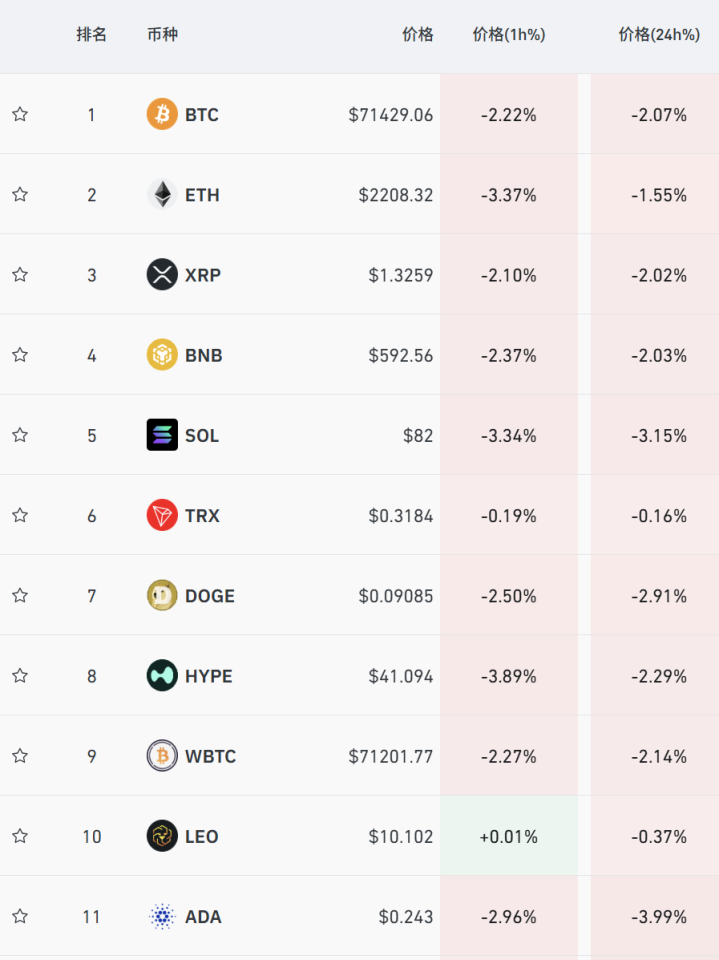 加密货币市集集体走低,ETH跌至2200好意思元隔壁,XRP、SOL、DOGE等主流币种均有明显跌幅。