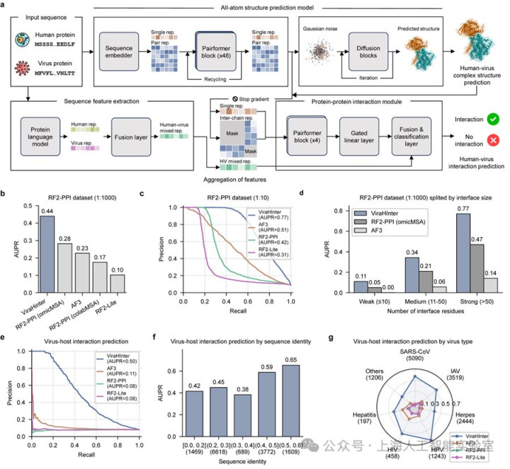 两种信息通过肃穆力机制深度会通——面临结构了了的卵白,模子更依赖结构信息;面临快速变异或无序的病毒卵白,则更依赖序列信息。这种自稳妥会通,恰是ViraHInter跨病毒眷属泛化身手的要津。在最接近信得过筛选场景的1:1000正负样本极端抵御衡评测中,ViraHInterAUPR达0.44,显耀特出RoseTTAFold2-PPI(0.28)、AlphaFold3(0.23)、RF2-Lite(0.10)。更要津的锻练在于面临“生分”病毒的身手——这平直联系到模子是否适用于新发病原体。在序列同源性严格受控的测试中(即测试病毒与教师王人集病毒的序列相通度不跳跃60%),ViraHInter的AUPR达到0.50,比AlphaFold3(0.11)高4.5倍,比其他要领高6倍以上。