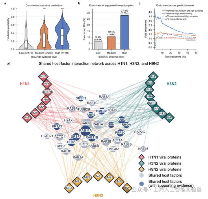 识别33个中枢分享宿主因子 所谓分享宿主因子,是指被多种不同病毒共同诓骗、以完成其感染和复制周期的宿主细胞卵白、酶或通路。举例,甲型流感病毒有多种亚型(如H1N1、H3N2、H7N9亚型等),不同亚型感染的细胞类型、引起的症状各不调换,但它们时时依赖一些共同的宿主卵白完成感染和复制。淌若一种药物大约靶向这些分享宿主因子,就可能同期对抗多种流感亚型——这恰是广谱抗病毒药物的中枢念念路。 流感病毒的名义卵白不停变异是季节性流感疫苗需要每年更新、大流行难以戒备的根底原因。但ViraHInter揭示了一个值得温暖的时局:尽管H1N1、H3N2、H9N2三种流感亚型的名义卵白(如血凝素)序列相反显耀,它们所依赖的东谈主体宿主卵白却高度重合。 科研团队诓骗ViraHInter,在东谈主类全卵白组范围内对这三种流感亚型的10个要津病毒卵白(包括PB2、NS1、NP、HA、PA等)进行了系统筛选,最终锁定33个被三种亚型共同靶向的中枢宿主因子。其中12个因子在已有推测中已被说明参与流感感染历程,但从未在职何病毒-宿主互作数据库中被记载,反馈出ViraHInter大约识据说统执行要领难以捕捉的相互作用; 另外,在冠状病毒推测中幸运彩app下载,ViraHInter也发现了近似活动:针对SARS-CoV-1、SARS-CoV-2和MERS-CoV的分析分解,RAB8A卵白与病毒非结构卵白NSP7的勾搭界面在三种冠状病毒中高度保守,领导RAB8A可能是多种冠状病毒共同依赖的要津宿主因子,可算作广谱抗冠状病毒药物研发的靶点。 188bet体育app中国官网 |