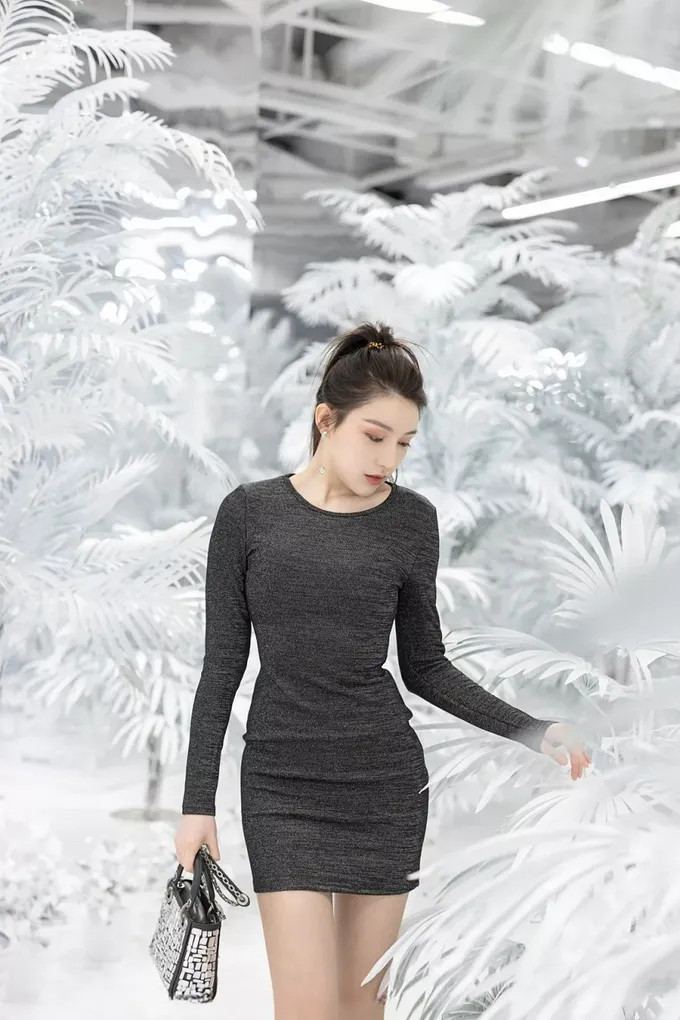 从正面看,这件连衣裙领受了极简的圆领和长袖联想。这种包裹感极强的正面剪裁,是对传统职场礼节的一种问候。它络续了矛头,展现出一种内敛、专科的姿态。长袖的联想在视觉上拉长了手臂线条,同期均衡了短裙带来的露肤度,作念到了“欲扬先抑”的视觉张力。 剪裁的神思:背影杀手与弧线的重塑 如若说正面的包裹是对职场的尊重,那么背后的联想则是对自我魔力的尽情开释。轻熟性感的精髓,在于“露得高档”。