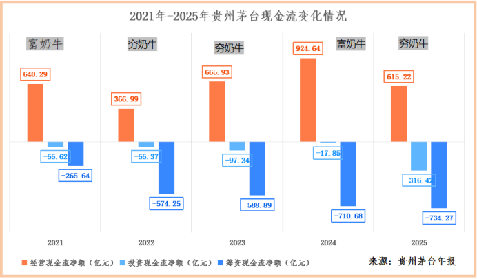互联网刚兴起的那段时间,各大IT公司都需要一个“前言”将自己名气打出去,作念周全球型强企。 蓝色光标正好意思瞻念中了这一阛阓缺口,凭借已有的公关栽种,在内对接IT公司,在外对接谷歌、TikTok等告白平台,作念起了“流量售卖”的生意。 凭借“以效果为导向”的就业气魄,蓝色光标快速蓄积了上千家客户,填补了国内阛阓这一空缺。直于今天,“流量代理”依旧是其住持旦角。 可这位住持旦角的盈利才略还是大不如前了。2025年,蓝色光观念毛利率已低至2.63%,减掉关联的用度支拨,基本不得益。 明天,蓝色光标能否保管这种“踏实”的现款流气象还未可知。这亦然为什么公司近期在积极将业务重点向AI营销歪斜。 至于AI营销能否让蓝色光标重焕期许,咱们在《560亿!AI营销第一股,国外狂飙》一文中已防护先容,这里就未几赘述。 “奶牛型”最受接待,但优质奶牛未几了。 “奶牛”的特质是:公司主营业务能挣钱,回馈激动的同期,还能连接投资延伸,兼具成长性与踏实性,这无疑是人人眼中的“尖子生”。 也曾,贵州茅台是“优质奶牛”的代表。茅台镇特有的水质、微生物群落以及阵势条款让茅台酒具备了无法复制的居品上风,公司毛利率终年超90%。 重叠白酒无保质期、“越老越值钱”的脾气,让公司无谓为存货的盘活情况烦懑。就这么,往时很长一段时间,贵州茅台都在大额进账,同期还能连接延伸产能、给激动大额分成。 可2025年,在宏不雅环境的影响下,贵州茅台营收和净利润分歧同比下跌1.21%、4.53%至1688.38亿元、823.2亿元,惊现10年来初度事迹双下滑。 为增强激动信心,贵州茅台2025年大手笔分成和履行回购,致使其筹资现款流净额大幅吃亏734.27亿元。 而同期,公司筹谋现款流净额仅为615.22亿元,已不可全都遮蔽筹资现款流出和投资现款流出(-316.42亿元),从当初的“富奶牛”变成了“穷奶牛”。