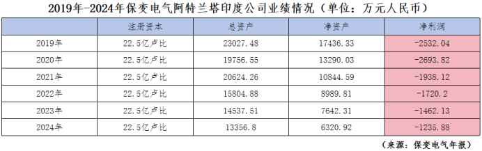 有东谈主会问,妖精型现款流难谈不好吗?主营业务能得益,公司投资也能得益,还在对外融资,三处来钱,岂不乐哉? 可仔细想想,若是一家公司的现款流永远是“妖精型”,那赚的钱和筹的钱既不投资也不分成,会去哪呢?很值得东谈主深想。 好在,保变电气的现款流并莫得永远呈“妖精型”,暂时不需要沟通这些。但从其近五年的现款流变化看,也不是多乐不雅。 2022年,公司现款流致使呈现出“负负负”的大出血型状态,这诠释,保变电气的潜在风险照旧存在的。 随意来说,风险在两点:一是投资失利;二是主营业务失速。 2012年运转,保变电气为打建国外阛阓,聘请费事印度,倾尽全力匡助印度打造供电网罗,前后砸了十几亿资金。可临了发现,这是一场针对外资的“局”。 用数据谈话,保变电气印度子公司从2019年运转泄漏事迹,一直到2024年,年年都吃亏,累计吃亏额达1.15亿,净财富也从2019年的1.7亿缩水到6300万,径直腰斩,实时止损是最佳的聘请。